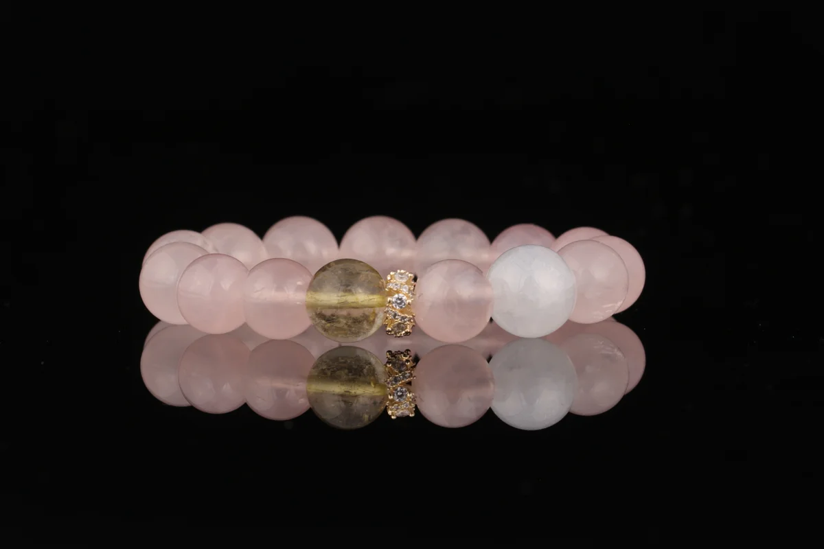 Q.What are the respective functions of the rose quartz, white phantom quartz, and yellow tower quartz in the bracelet?