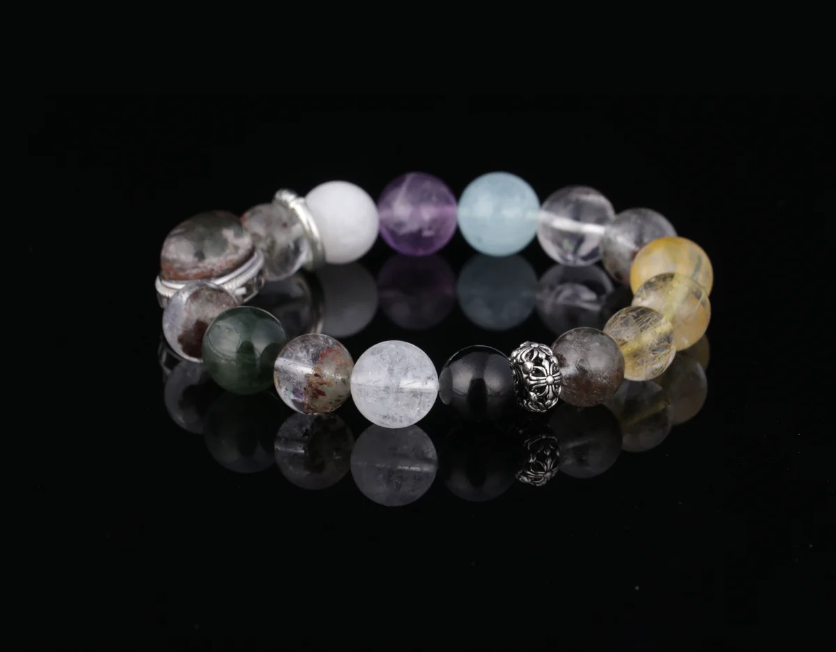 Natural Crystal Bracelet Flower Phantom Aquamarine Amethyst Rutilated Quartz Multi-Gem Energy Strand for Wealth, Luck, and Sleep