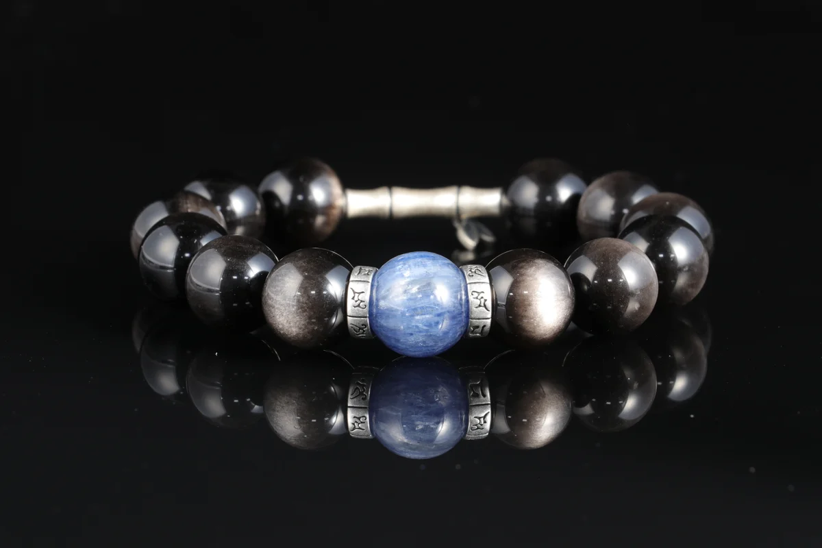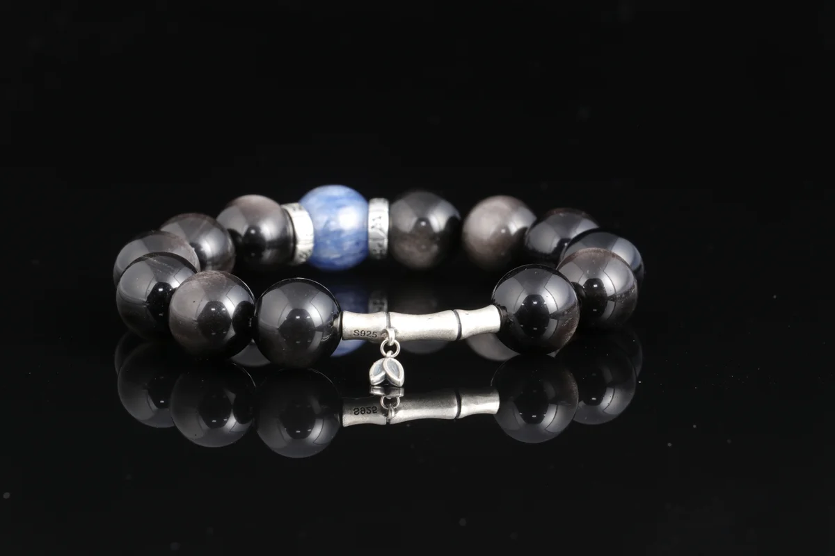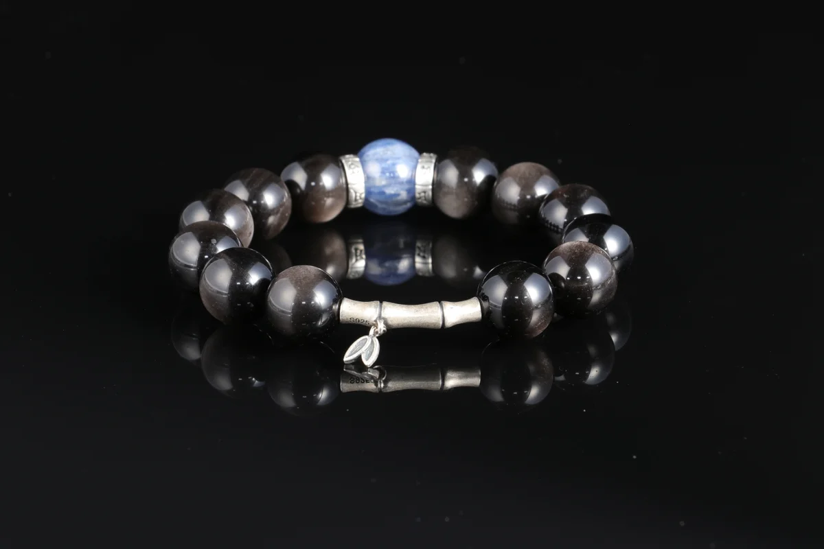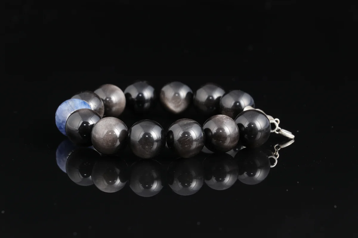 Natural Silver Sheen Obsidian Aquamarine Bracelet, Customized for Birthdate, Wealth-Attracting and Evil-Warding Energy Crystal Bracelet for Gift or Personal Use