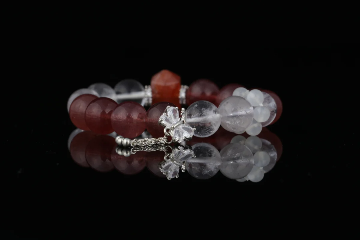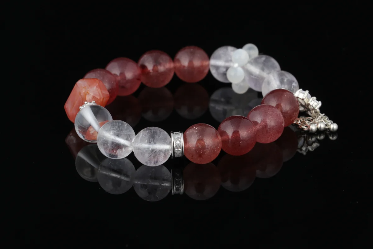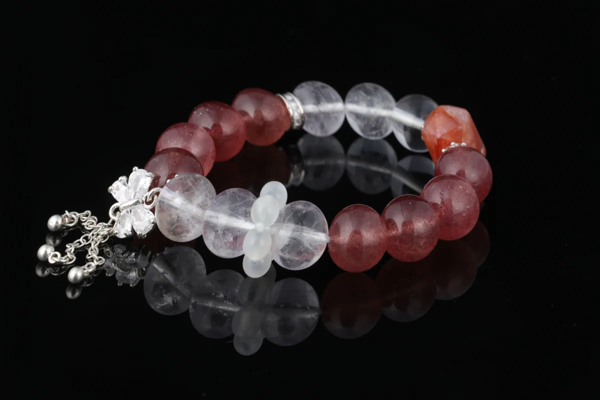 celet based on birth date? Answer: This Strawberry Quartz and Clear Quartz bracelet supports personalized energy customization according to birth date. The specific method involves optimizing energy flow through the principle of "left in, right out" when wearing it. As mentioned in the product description, the customized design helps users better attract wealth and prosperity. By combining the dual-stone energy of natural Strawberry Quartz and Clear Quartz, the energy is adjusted according to the individual's birth date to enhance the effects of attracting positive romantic relationships, boosting interpersonal connections, and inviting the support of noble people. With daily wear, this customized energy continuously safeguards the user's positive aura.