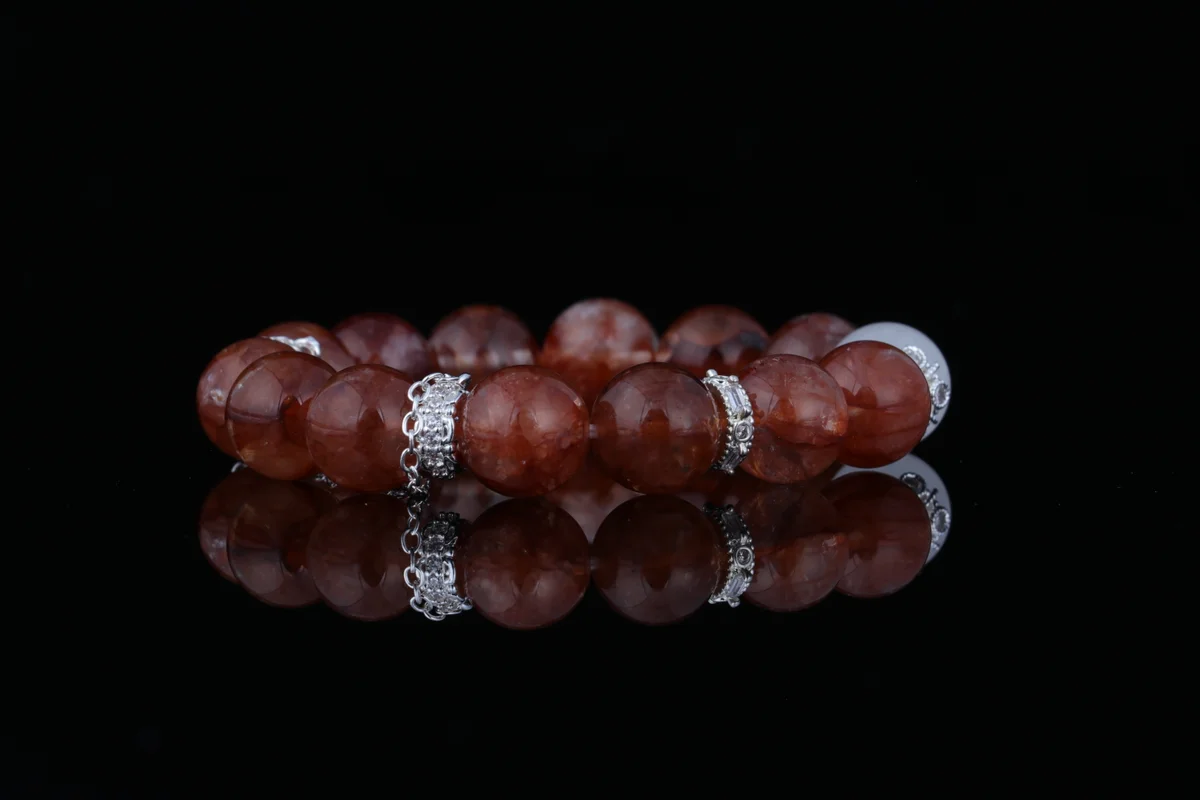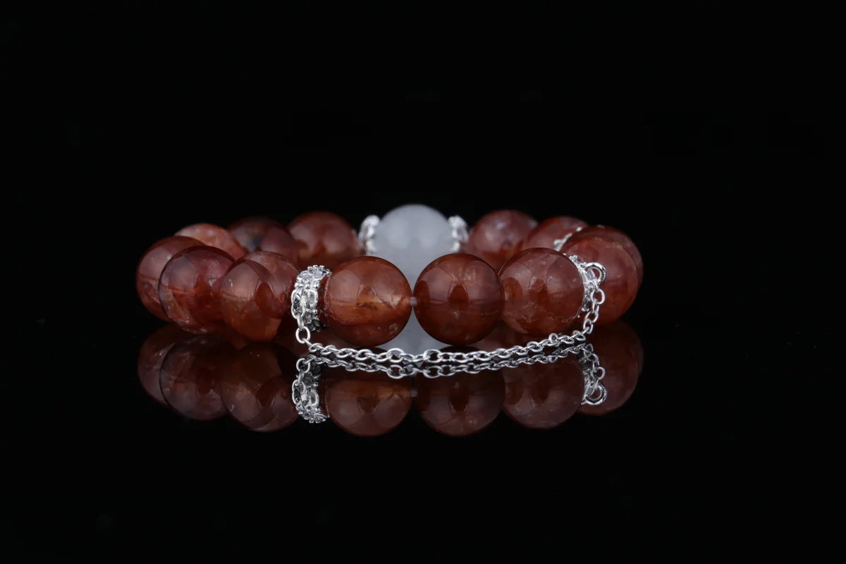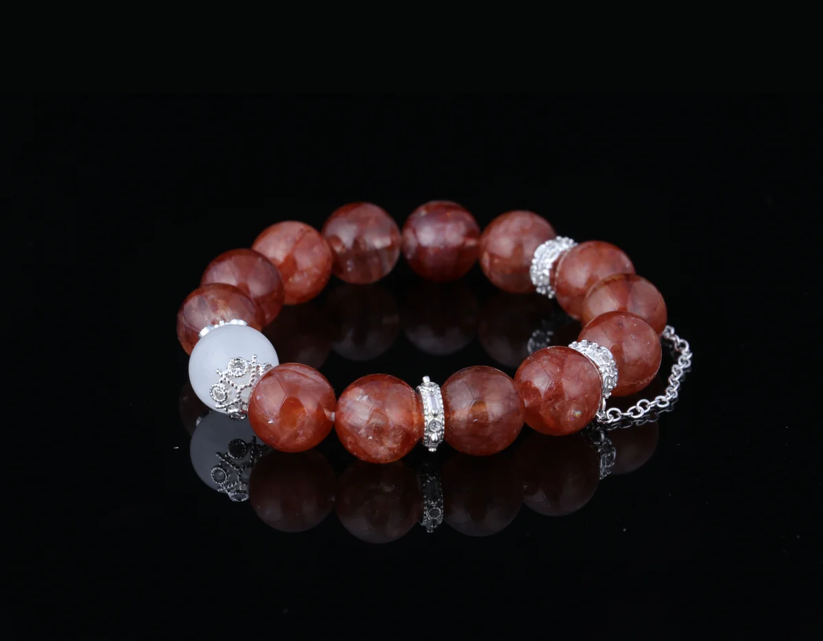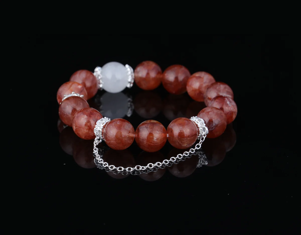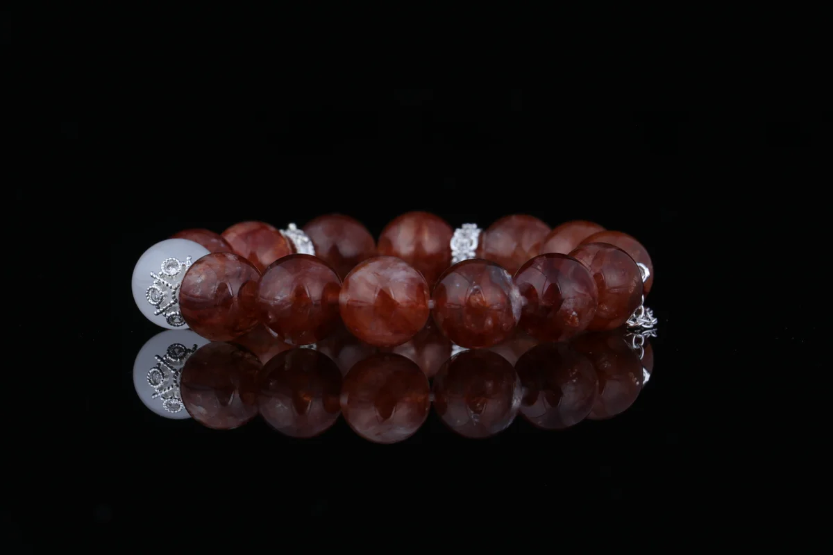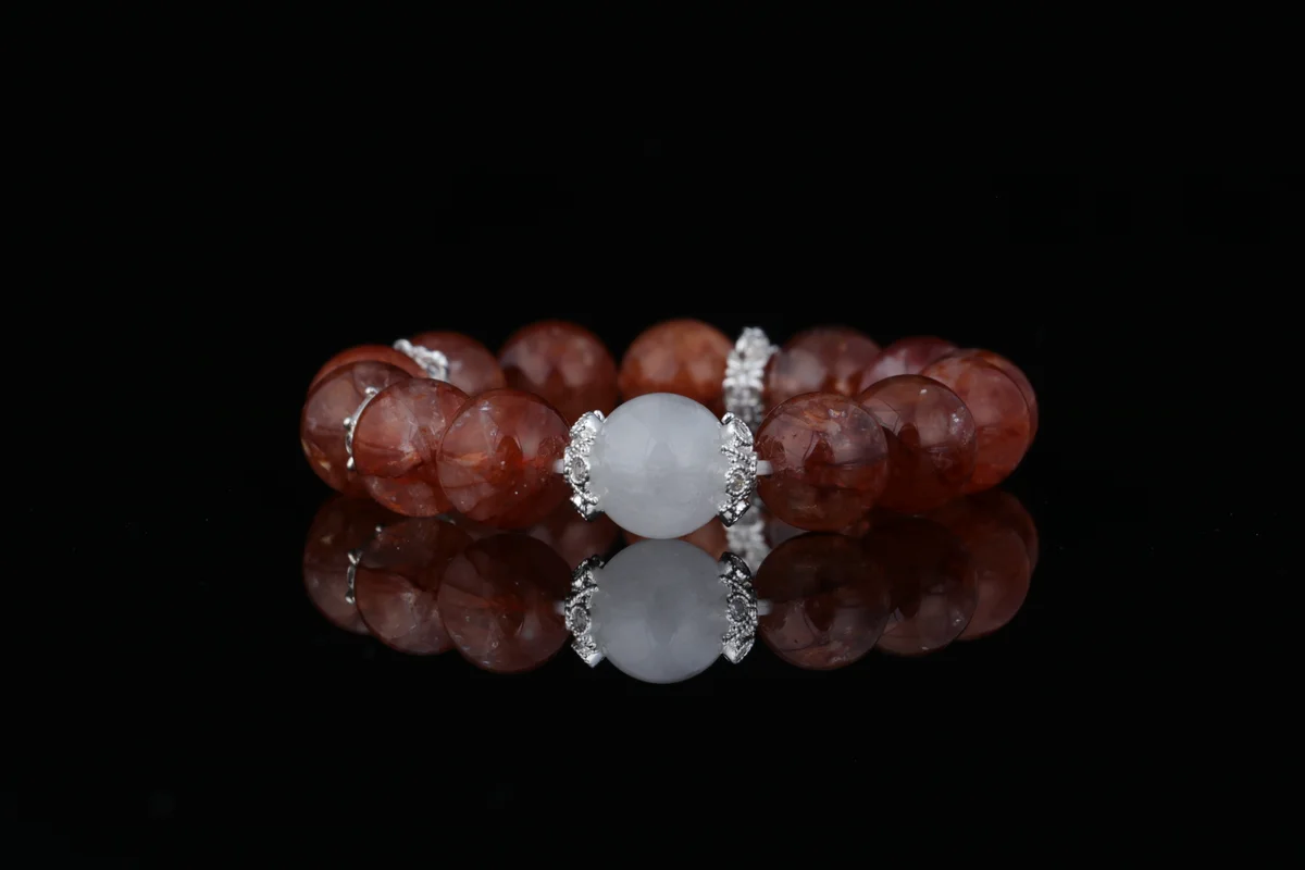 t is the material of the bracelet, and what are its characteristics? Answer: The bracelet is crafted from carefully selected natural red phantom-included white quartz. This is a unique natural crystal where red phantom inclusions coexist with white quartz, creating a visual effect reminiscent of "gold within fire." Each bead is one-of-a-kind, with distinct patterns, ensuring the exclusivity and uniqueness of every bracelet. This natural material is not only aesthetically pleasing but also carries high-frequency energy, serving as the core foundation of the product's efficacy.