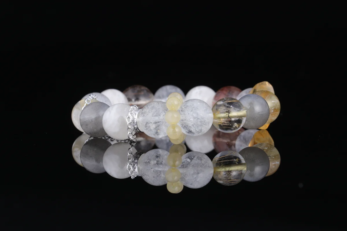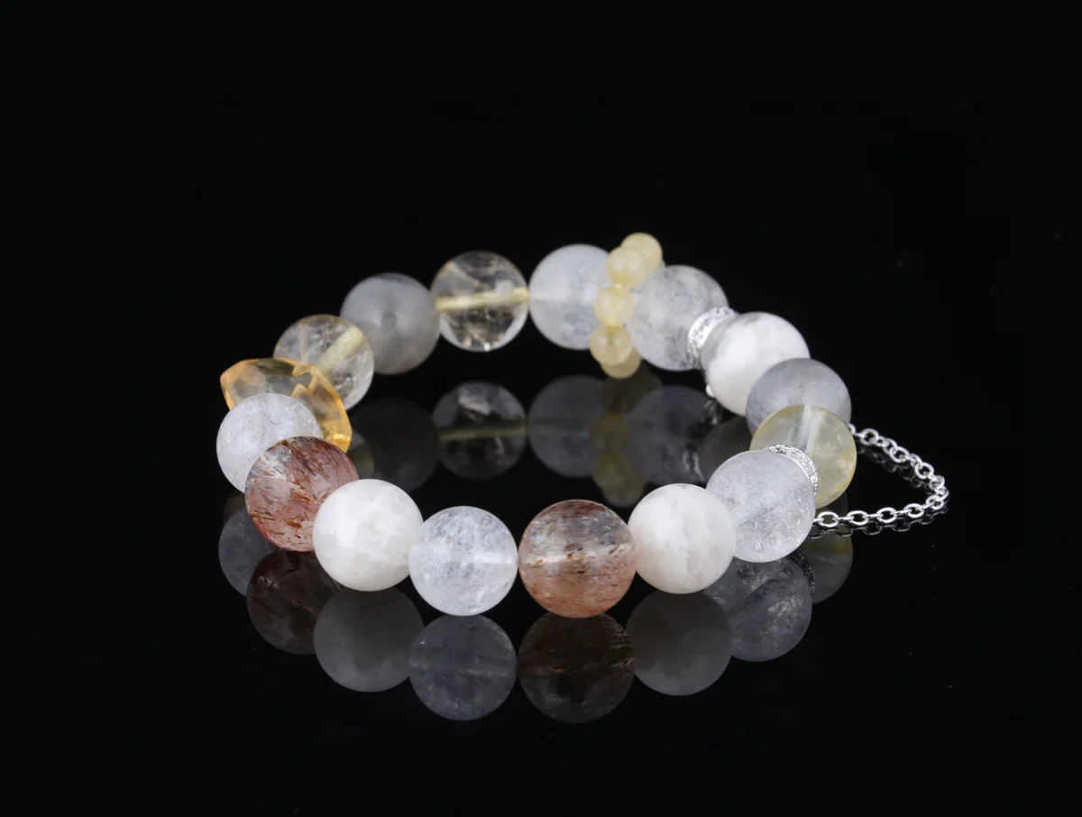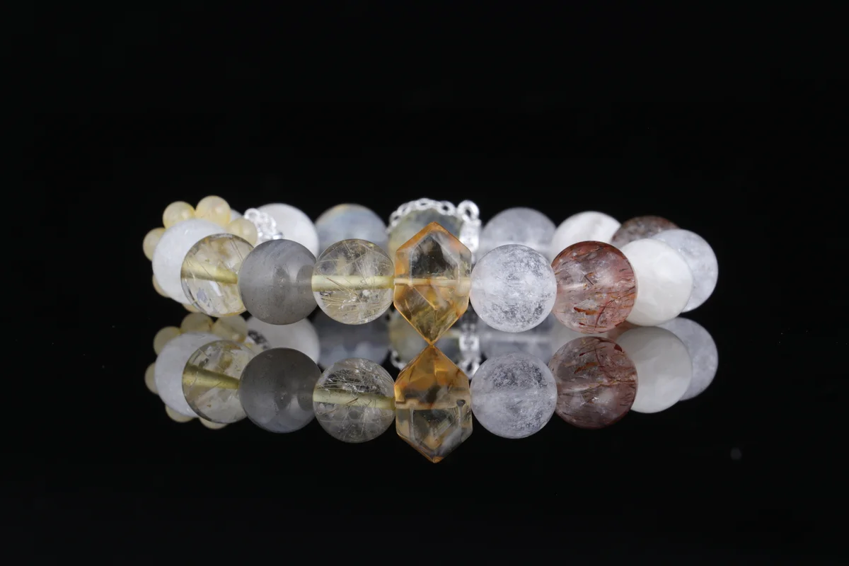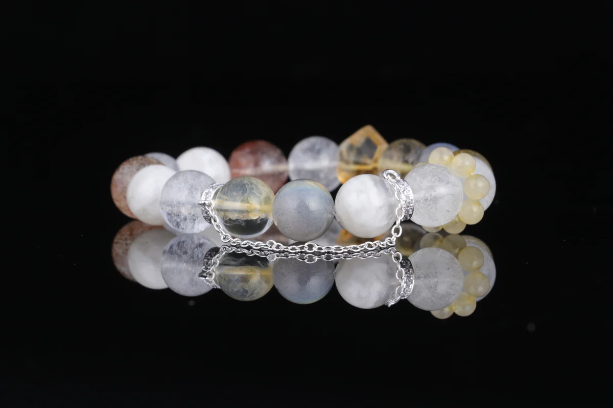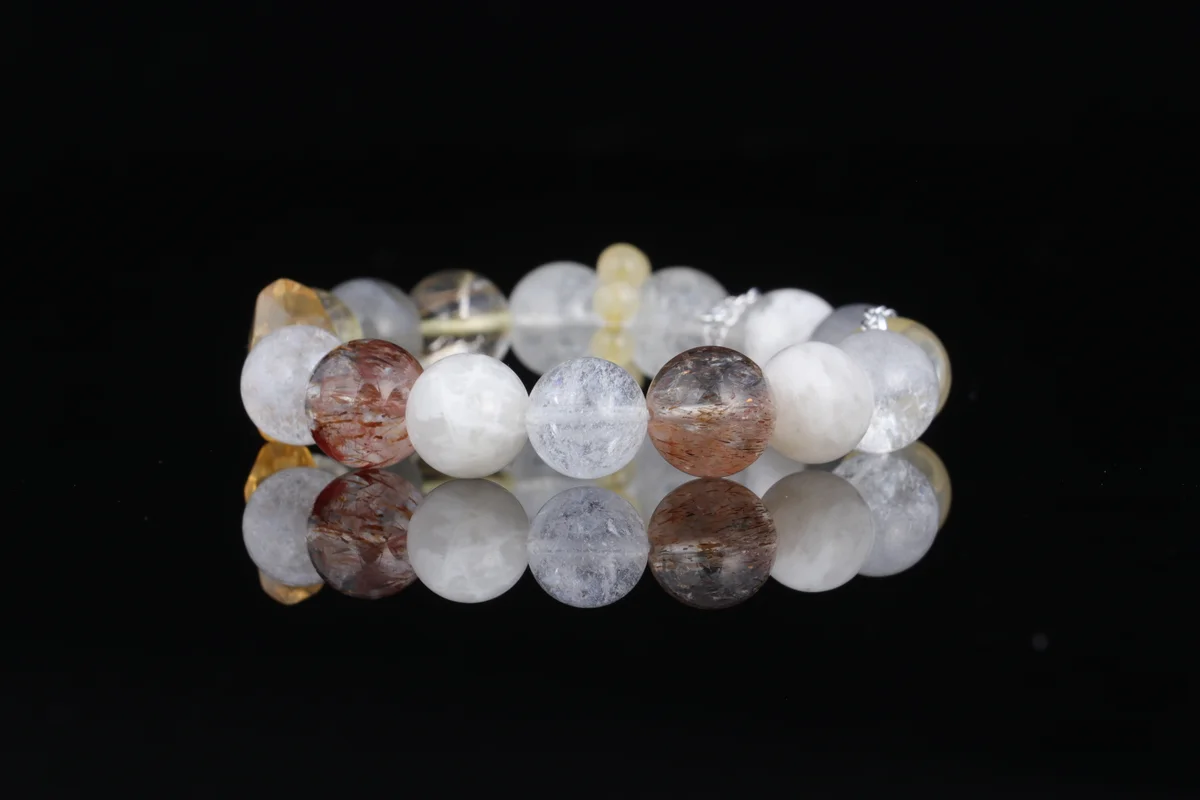 t are the characteristics of the bracelet's material and design? Answer: The bracelet is crafted from natural Black Rutilated Quartz and Moonstone, each bead a gem nurtured by the earth, carrying unique energy. In terms of design, the natural Phantom Wedding Veil crystal patterns are one-of-a-kind, making each piece a limited-edition crystal, ensuring rarity and individuality. This combination not only enhances beauty but also strengthens multiple benefits such as attracting wealth, warding off negative energy, and promoting restful sleep, offering you a portable good luck talisman.