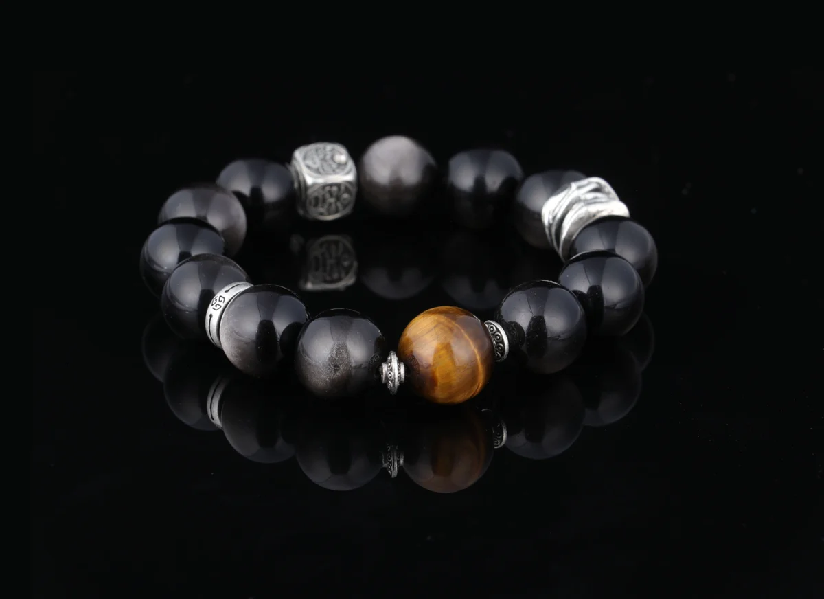 t are the characteristics of the bracelet's material and craftsmanship? Answer: This bracelet is crafted from natural Tiger's Eye and Silver Obsidian. Each bead is hand-polished from natural rough stones, ensuring a flowing cat's eye effect that resembles the watchful gaze of a tiger. As noted in the product description, every unique pattern is a one-of-a-kind gift from the earth, meaning each bracelet is truly unique. This custom birthstone energy bracelet combines traditional craftsmanship with natural materials to deliver optimal spiritual energy effects.