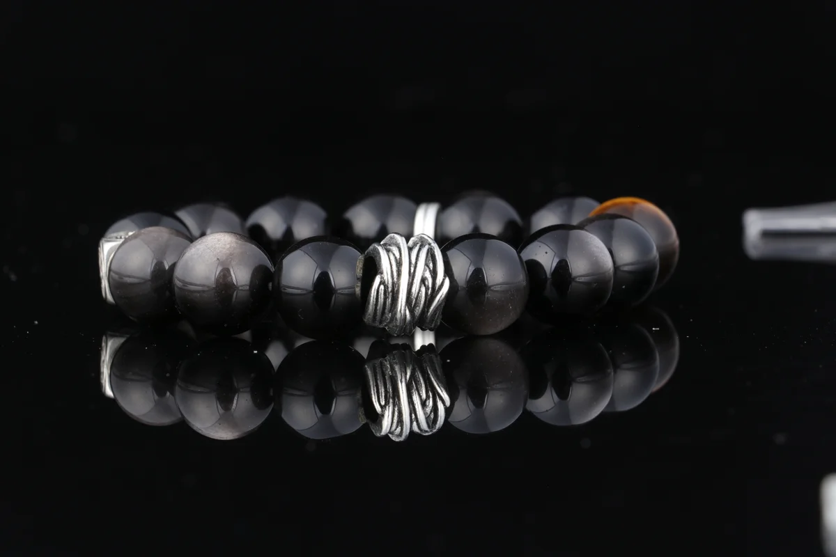 -32%Natural Obsidian Bracelet with Swirl Silver Custom Birthstone Energy Bracelet Wealth Attracting Evil Warding Luck Changing Bead