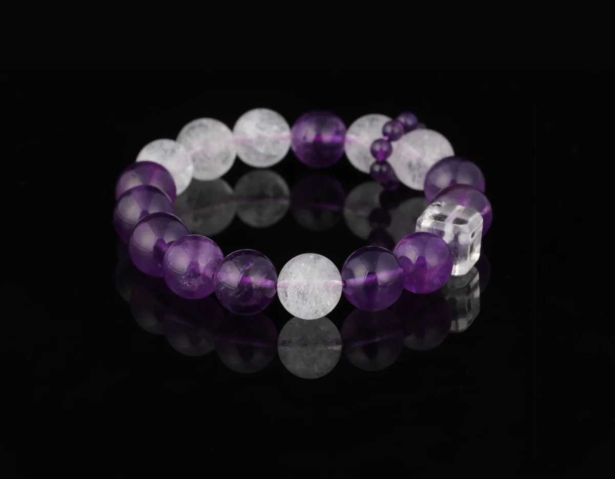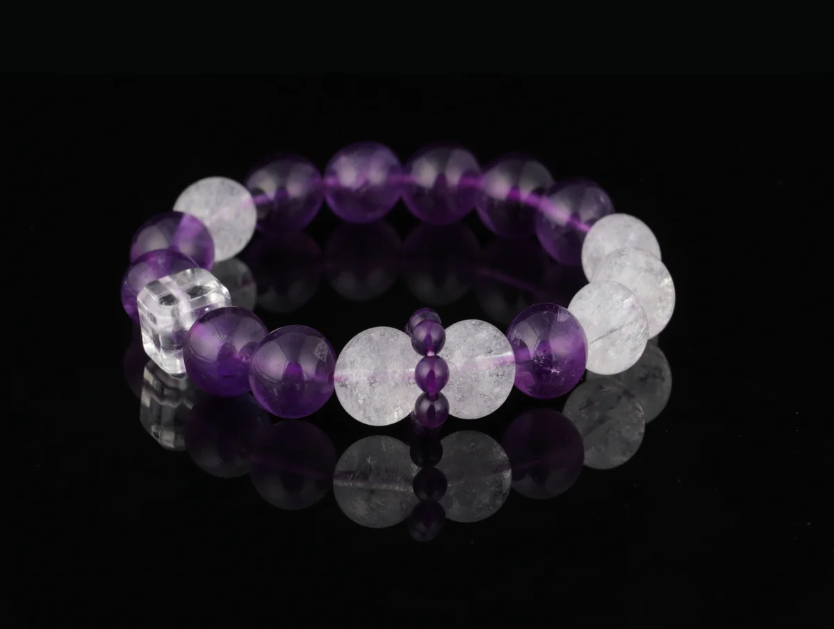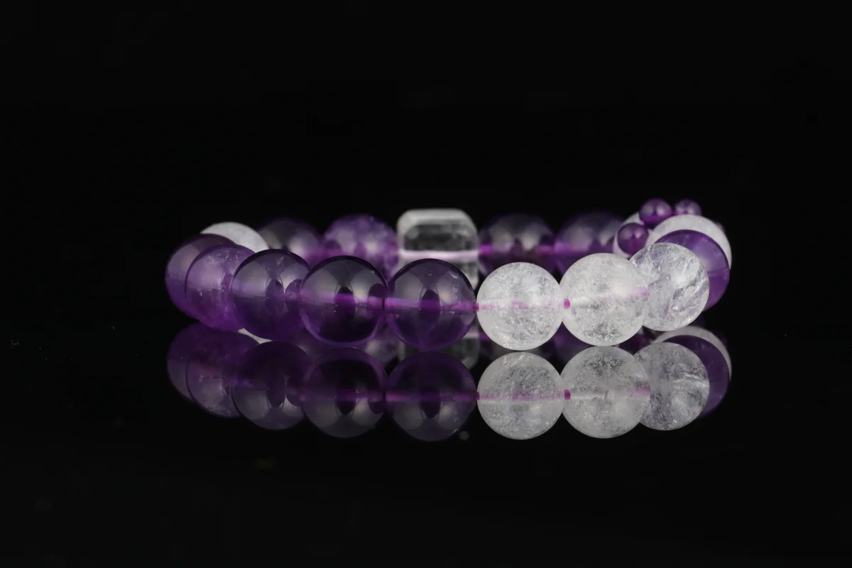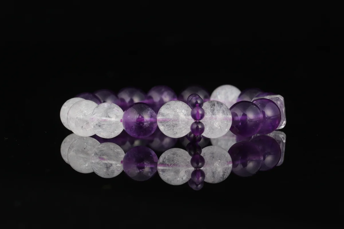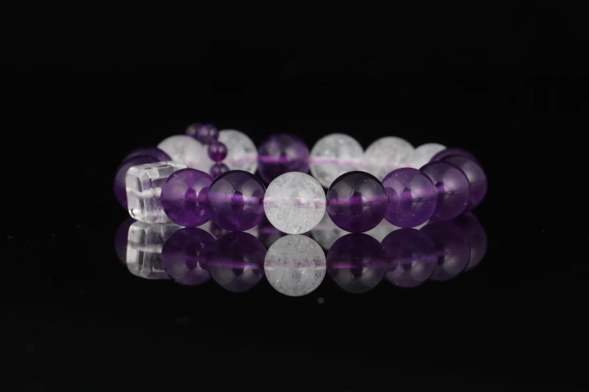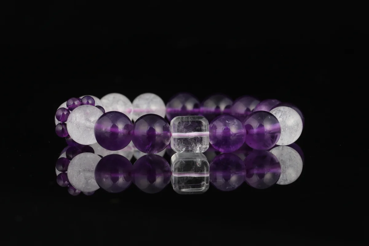 A.t is the material and quality of this bracelet? Answer: This bracelet is crafted from natural amethyst, featuring carefully selected transparent crystals with high-grade white flash characteristics that refract brilliant light in the sun. The product description emphasizes that it is not just an accessory but also an energy guardian stone, ensuring natural quality. It corresponds to the crown chakra to help alleviate stress, improve sleep, and is suitable for use as a health crystal and career crystal.