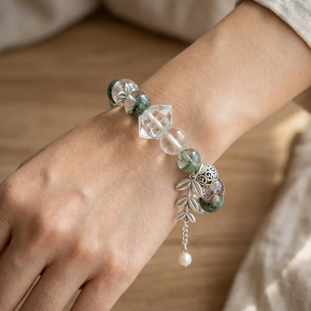t are the characteristics of the material and design of this bracelet? Answer: This bracelet is crafted from natural green tourmaline and clear quartz, with each stone being a unique piece shaped by nature, featuring a distinctive free-form design that highlights a light luxury and niche style. The natural crystals possess a lively luster and pure energy, requiring minimal processing to preserve the raw beauty of the original stones. It is ideal for users seeking a blend of individuality and energy.